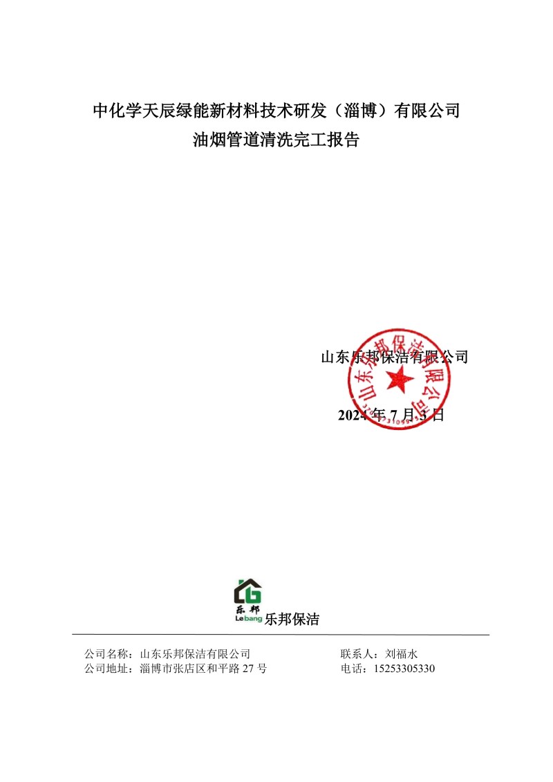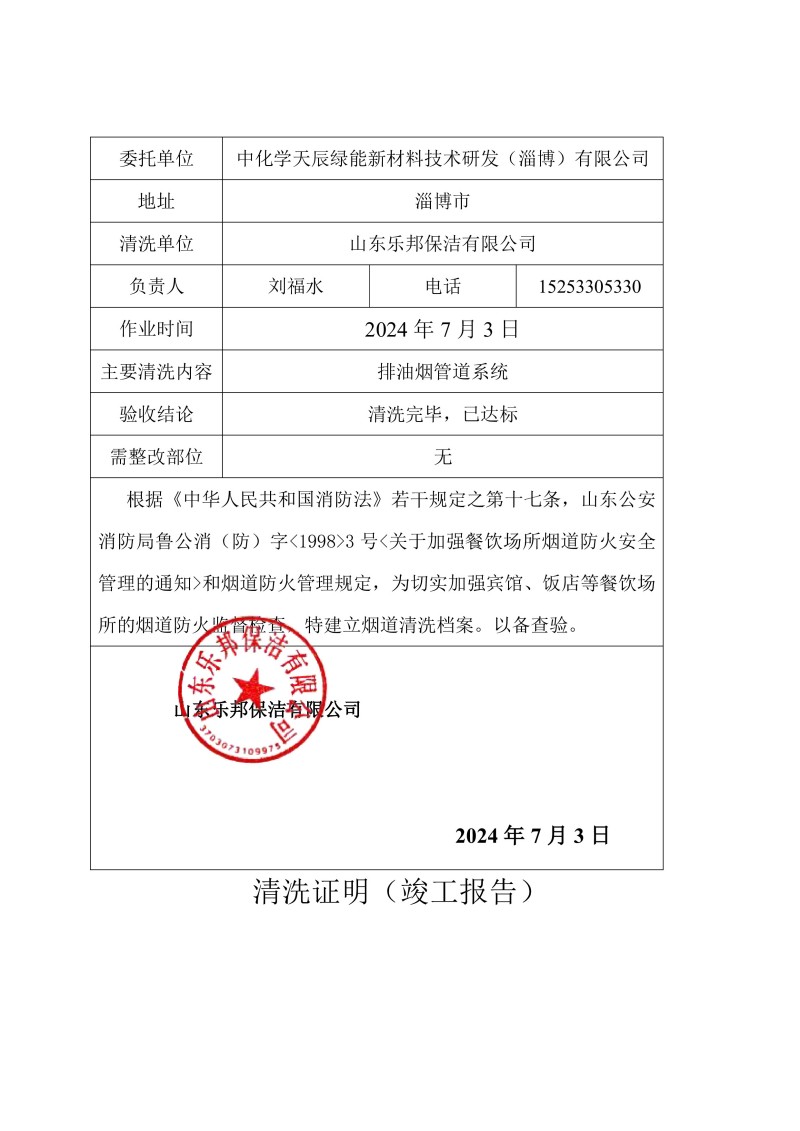 中化學(xué)天辰綠能新材料技術(shù)研發(fā)(淄博)有限公司清洗報(bào)告24.7.3